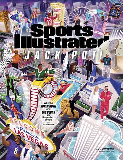 Ebbene, c'è una persona italiana che su quella copertina in qualche modo c'è finita, con merito. Il numero di febbraio 2024 è stato dedicato, ovviamente, al Super Bowl, la finale del football, l'evento sportivo più visto negli States e uno dei più seguiti in tutto il mondo. Per la prima volta si è disputato a Las Vegas, città sempre più “El Dorado” dello sport professionistico, come raccontavo in Galis #17 e accennavo in Galis #36. Il team di Sports Illustrated ha voluto celebrare l'evento valorizzando il servizio interno di Steve Rushin con un'illustrazione ad hoc.