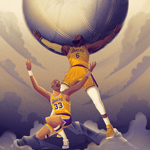 Sono tutte le mie “prime volte”. Quella sul New York Times, con un’illustrazione a tema “scandalo FIFA” creata nel 2015 ma uscita un anno più tardi. Quindi, la mia prima collaborazione con la NBA: nel 2016 (la stagione del titolo dei Cleveland Cavaliers) vollero comunicare tramite artwork tutti i match-up dei playoff. A quei tempi non avevano ancora un social team numeroso, per cui lavoravo di notte in Italia per far avere loro i visual quasi in tempo reale, appena concluse le partite. Infine, l’illustrazione sul Los Angeles Times per celebrare il record di punti di LeBron James e il sorpasso su Kareem Abdul-Jabbar, uscita il giorno successivo. Essere sul giornale della città, con un'immagine così grande e importante, è stato molto gratificante per me. Anche se sono e resto un “jordaniano”! A queste aggiungo la cover di Sports Illustrated per il Super Bowl.