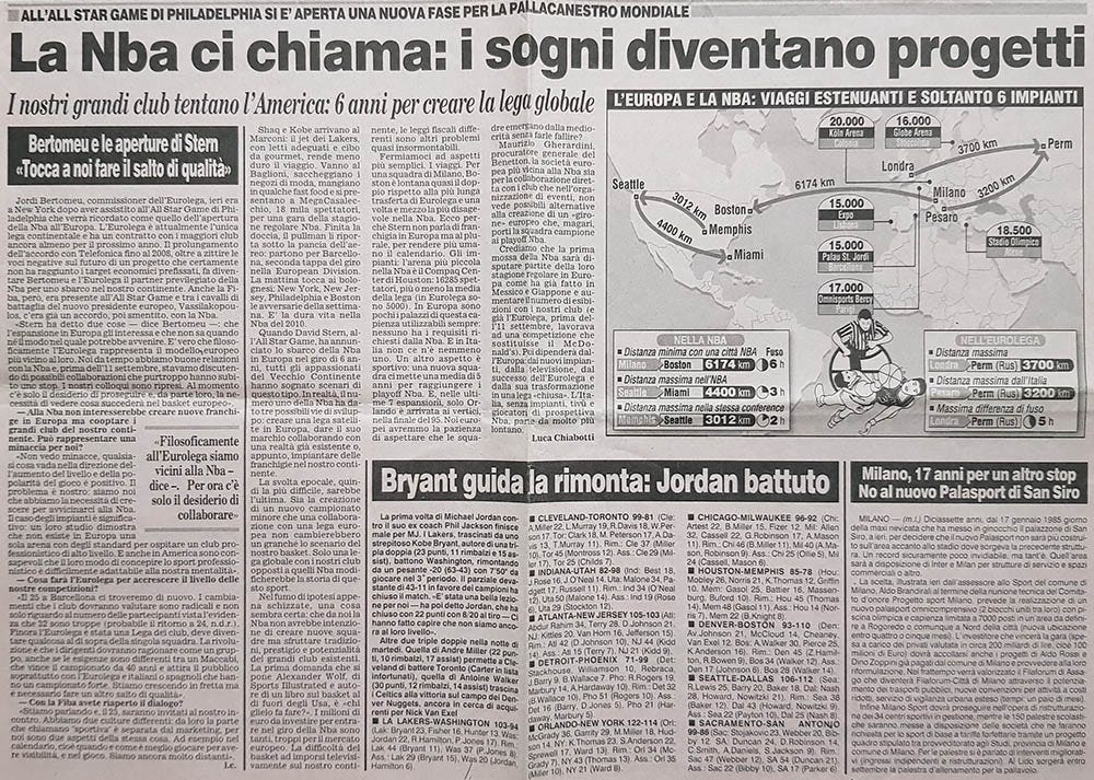 Hai appena letto l’incipit di un articolo apparso su La Gazzetta dello Sport ventiquattro anni fa, il 14 febbraio 2002. L’autore, Luca Chiabotti, introduceva con toni utopistici la possibilità di uno sbarco della NBA in Europa nel giro di qualche anno. Non si trattava tanto di un esercizio di fantasia, quanto di una riflessione sulle parole che l’allora commissioner David Stern aveva pronunciato durante l’All-Star Game.