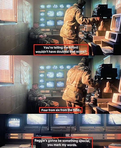 Ed è anche la data in cui Reggie Miller debutta con gli Indiana Pacers, dando il via a una carriera che lo porterà a diventare la star più fulgida che abbia mai vestito la divisa giallo-blu. Nella scena, due soldati discutono se al Draft NBA di quell’anno non fosse stato meglio scegliere Steve Alford, idolo di casa uscito da Indiana University (gli Hoosiers, tanto per restare in tema), che invece finirà ai Dallas Mavericks. Un dilemma che, all’epoca, aveva acceso parecchie discussioni tra gli appassionati di basket dello stato. Cioè la maggioranza della popolazione.